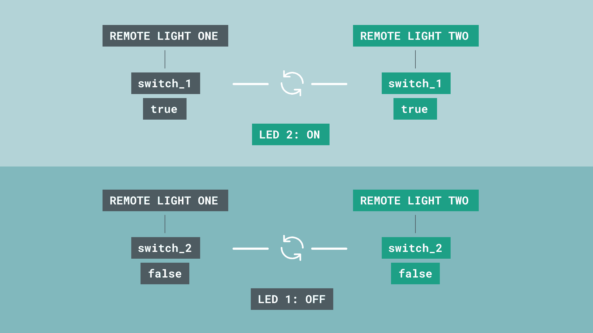 switch_2 is false, then the LED in Remote Light One will be OFF, and if switch_1 is set to true, the LED in Remote Light Two will be off.