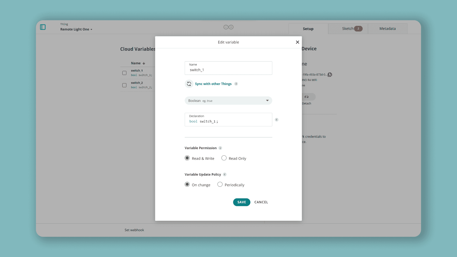 Next, we can repeat the same process for the boolean variable, but instead of selecting the switch_2 variable to sync with, select the boolean_sync variable. Now we should have two variables that are synced with our other Thing.