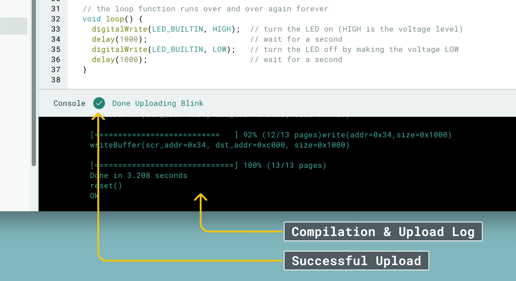The Cloud Editor is an online code editor which is part of the Arduino Cloud. With the Cloud Editor, you can write sketches and upload them to your Arduino board, where all your progress is automatically stored in the Cloud!