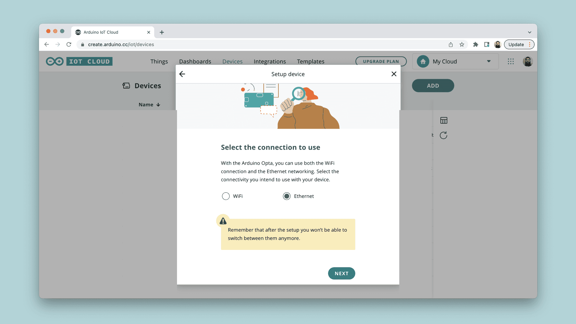 3. If you selected an Ethernet compatible board, you will receive an option to choose from Wi-Fi® / Ethernet. Choose Ethernet.