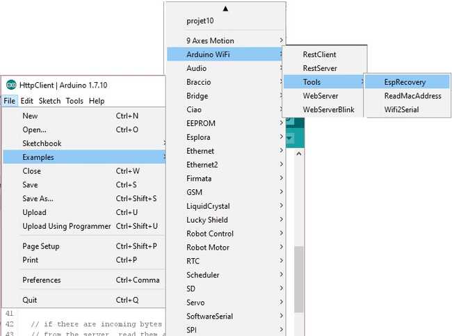 • Upload the ESPRecovery sketch from File>Examples>Arduino UNO WiFI>Tools menu of Arduino Software (IDE):