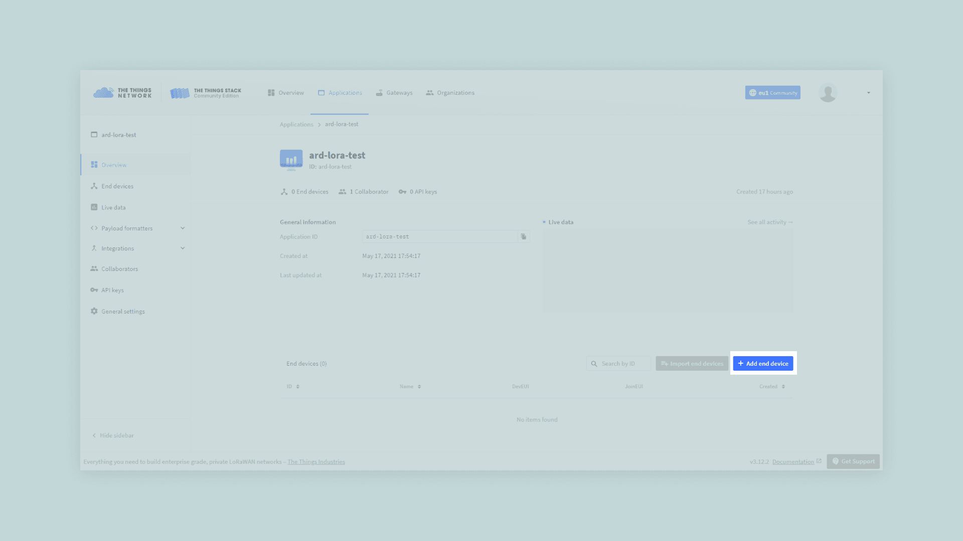 Here we need to fill in a unique name for our application. In this tutorial, we used ard-lora-test. When we have filled this in, we can click on the "Create application" button.