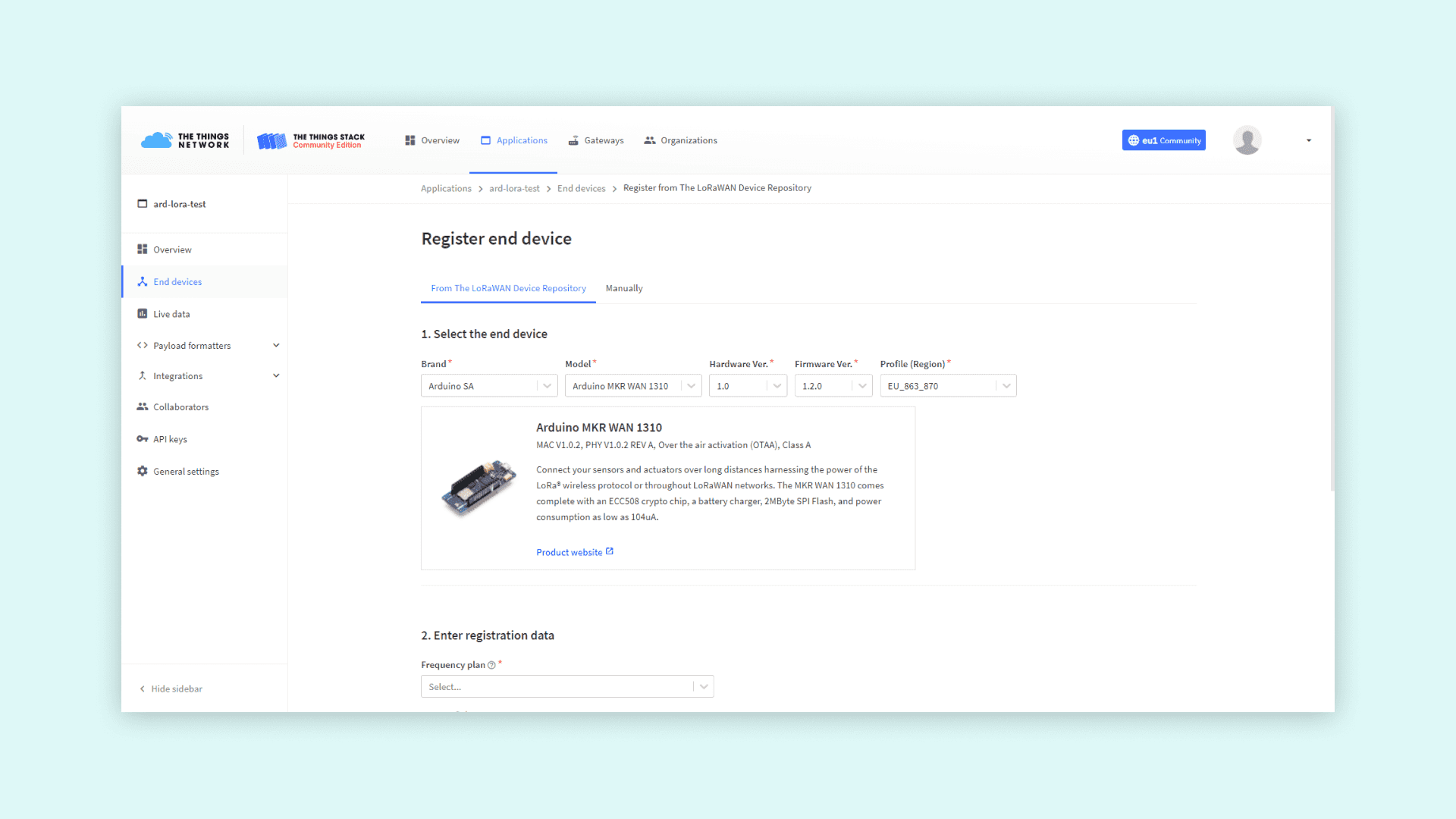 On the registration page, first we have to fill in information about our board. Select brand, Arduino SA, and then model, Arduino MKR WAN 1310 (a MKR WAN 1300 will also work with this selection). Hardware and Firmware versions will automatically select the newest ones. Then set your preferred region.
