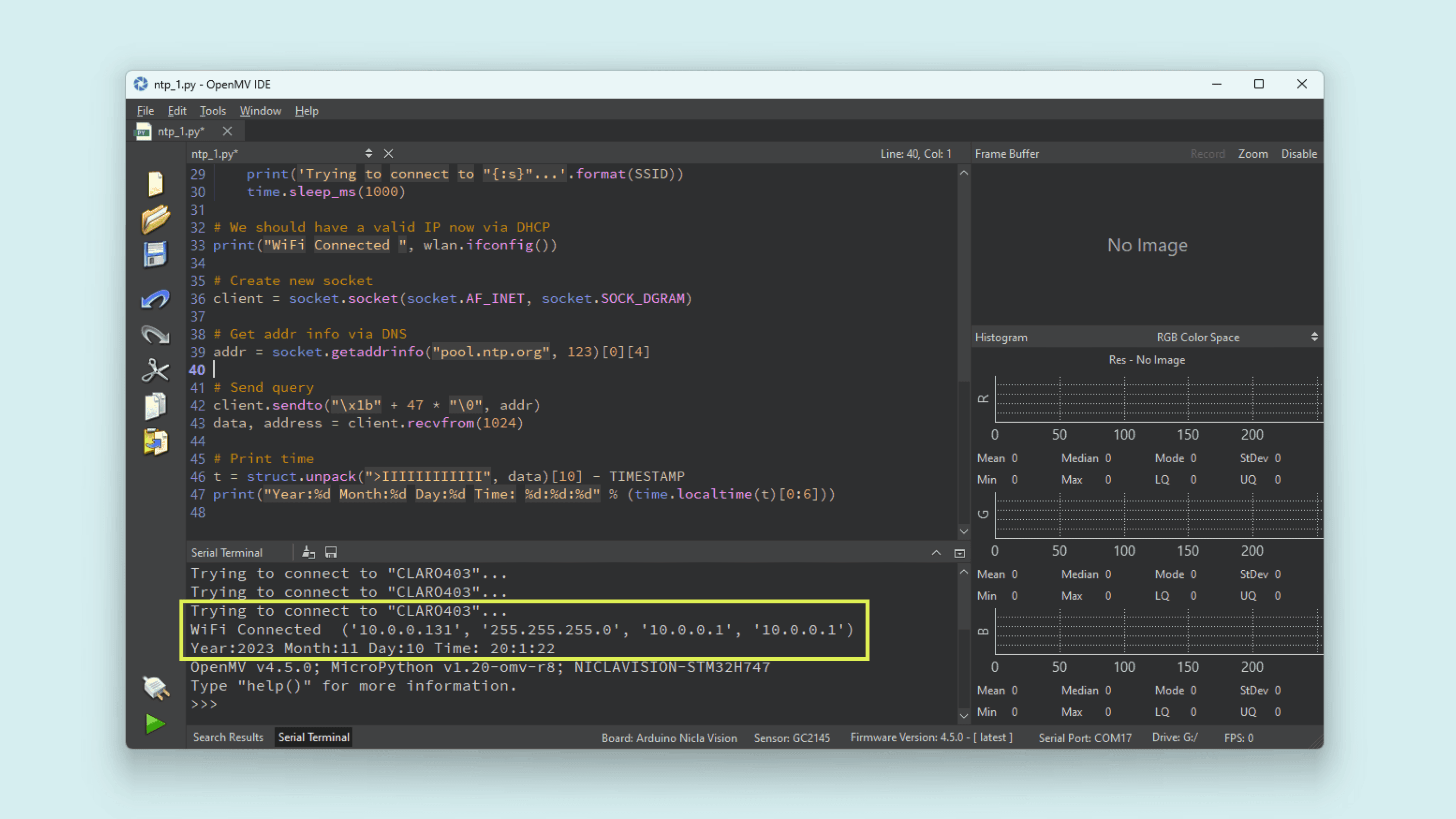 SSID and KEY variables and run the script from the OpenMV IDE.The current time and date will be printed on the IDE serial monitor.