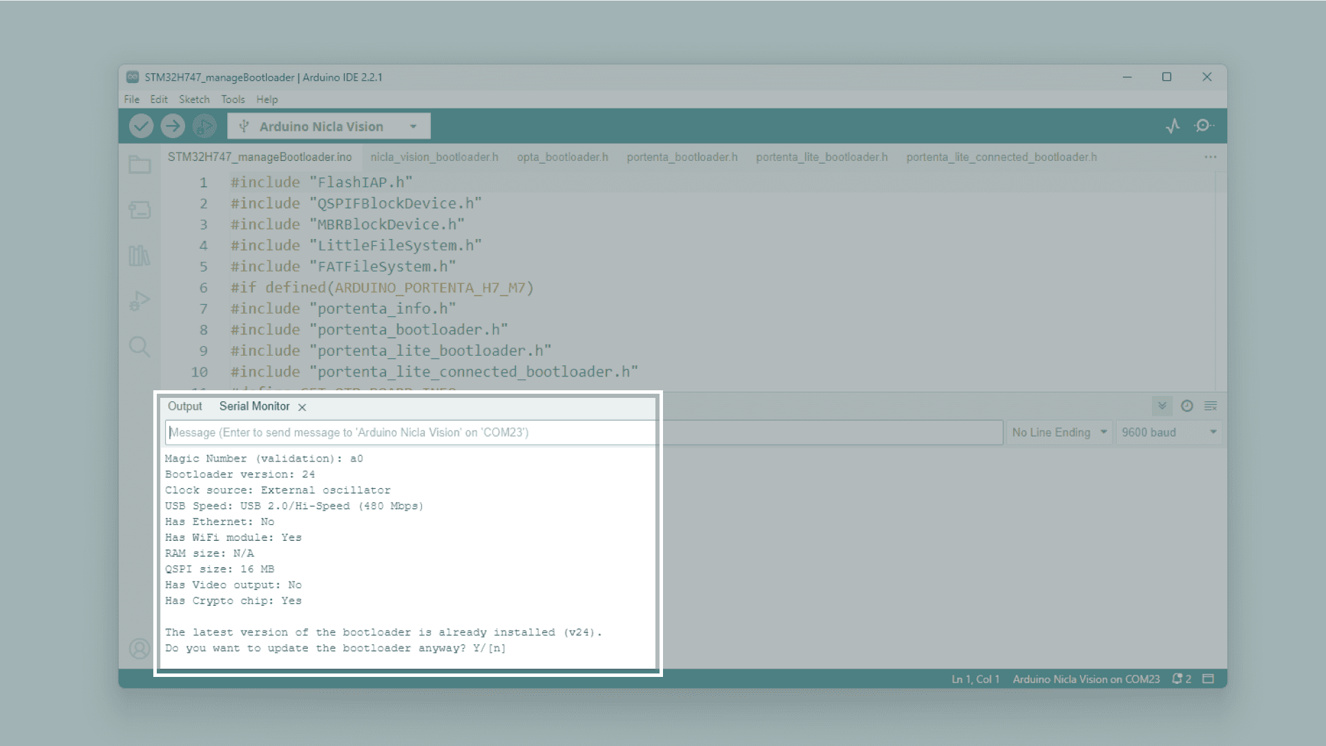 To update the bootloader firmware of your Nicla Vision, go to File > Examples > STM32H747_System > STM32H747_manageBootloader and upload this sketch to your board.