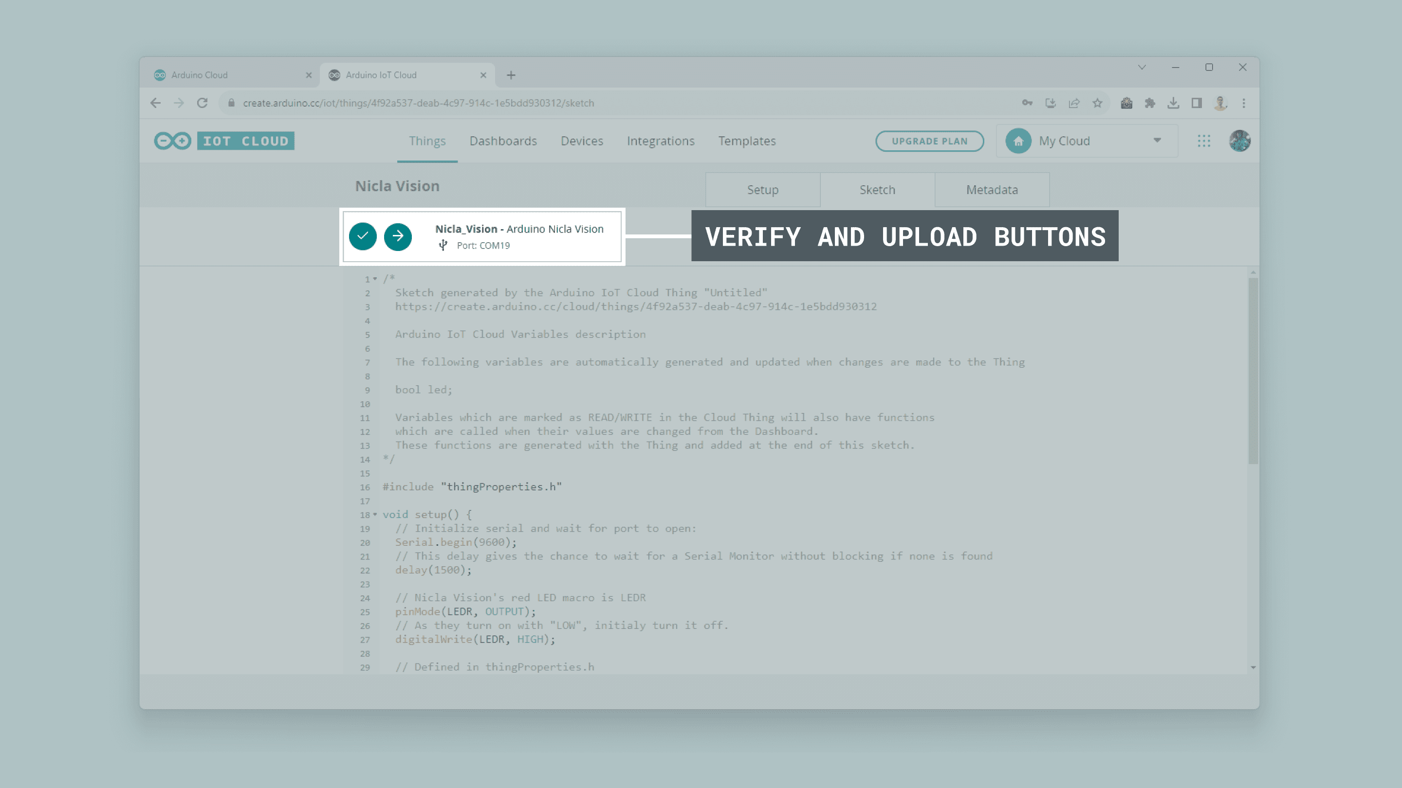 onLedChange() function, which was generated automatically by the Arduino Cloud when the variable led was created, you must associate the onboard red LED state with the led variable:1/*2 Since Led is READ_WRITE variable, onLedChange() is3 executed every time a new value is received from IoT Cloud.4*/5void onLedChange() {6 digitalWrite(LEDR, !led);7}To upload the code to the Nicla Vision from the online editor, click the green Verify button to compile the sketch and check for errors, then click the green Upload button to program the board with the sketch.