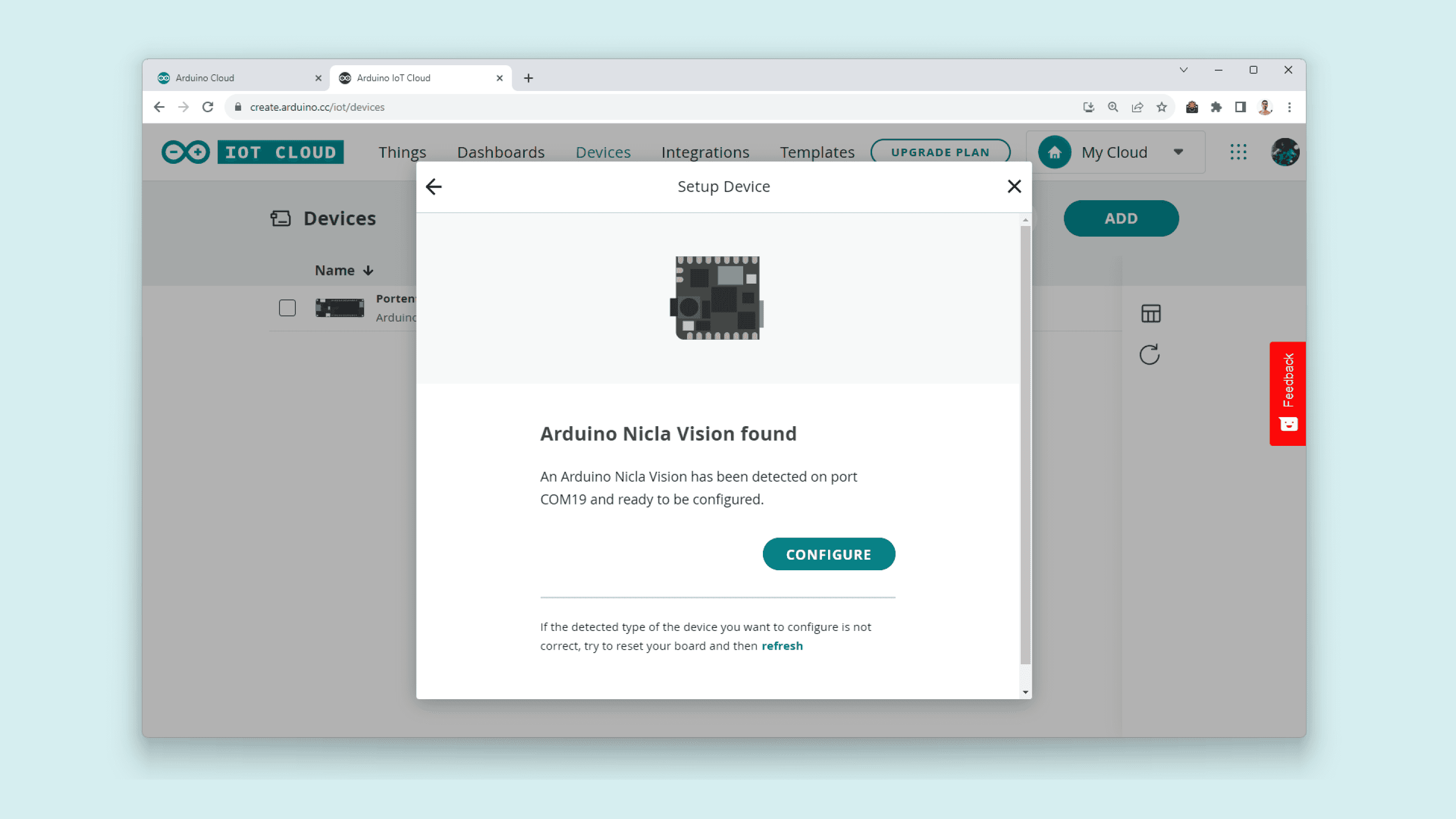 After a while, your Nicla Vision should be discovered by the Arduino Cloud, as shown below: