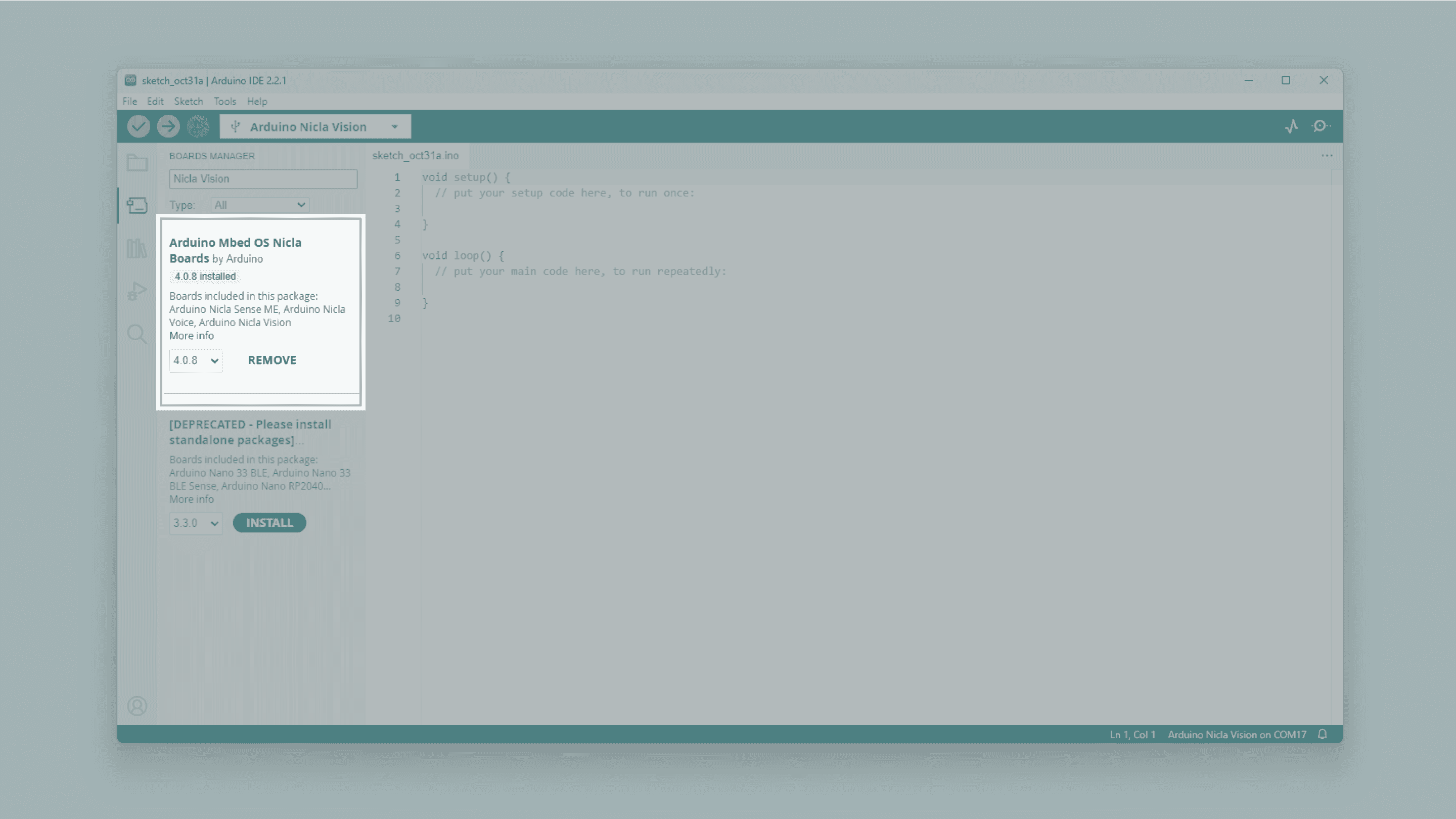 Nicla Vision and install the latest Arduino Mbed OS Nicla Boards version.