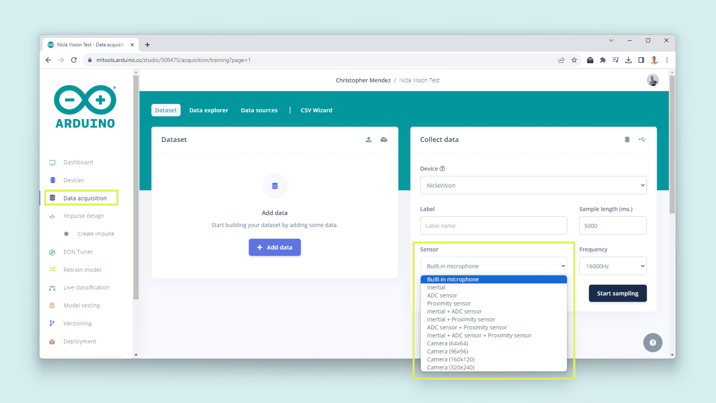 First, provision your Nicla Vision on your Arduino Cloud space. To do this, navigate to Devices and then click on the ADD button: