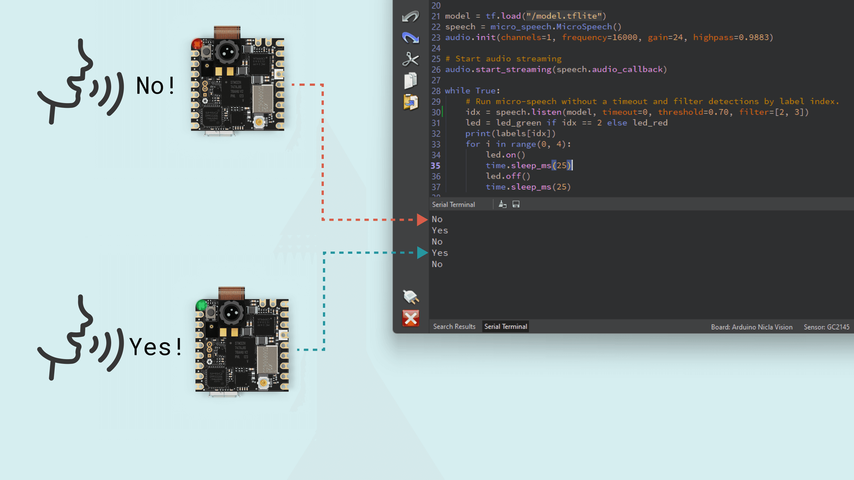 28}To upload the code to the Nicla Vision, click the Verify button to compile the sketch and check for errors; then click the Upload button to program the board with the sketch.