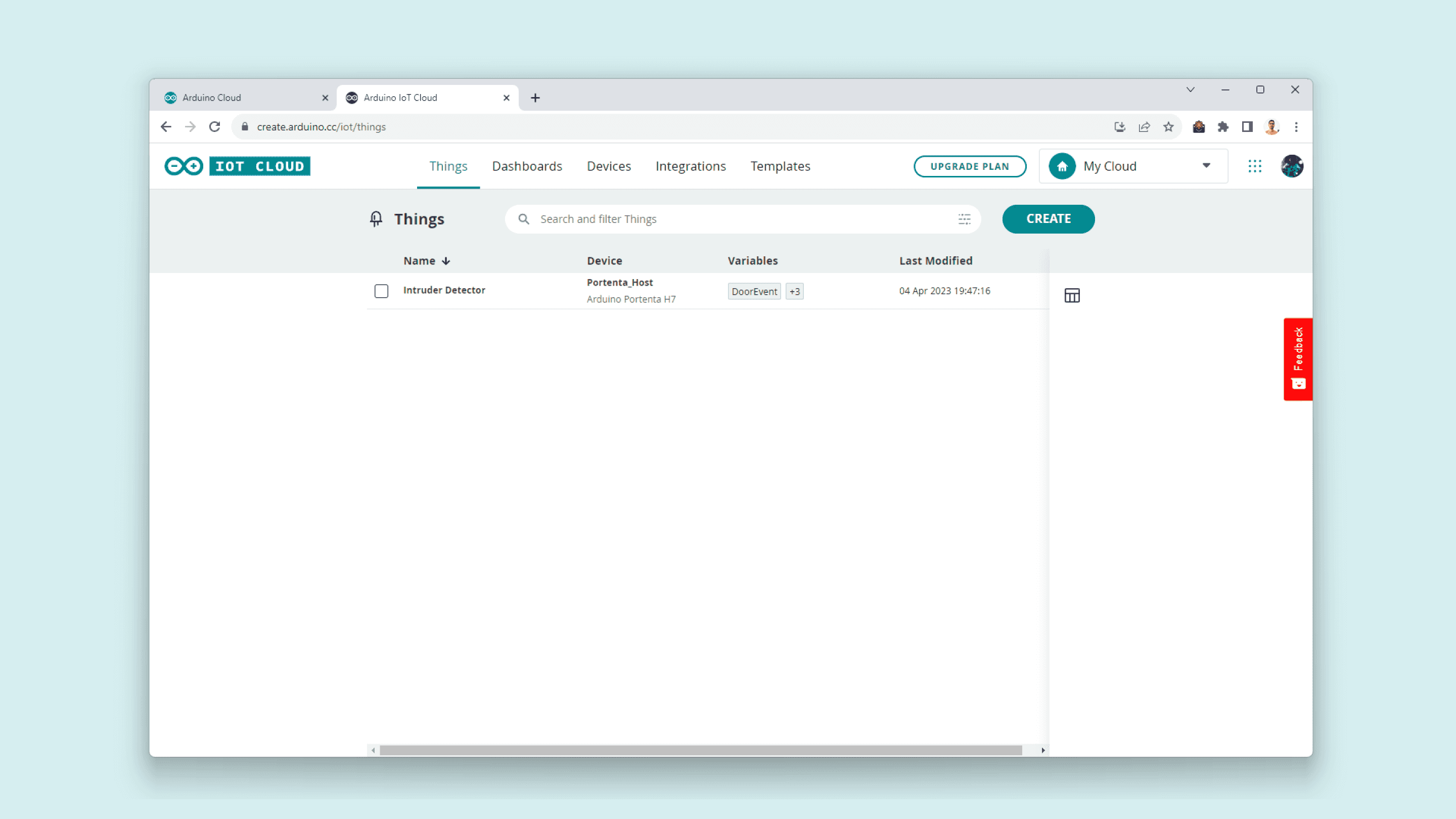Once your Nicla Vision has been configured, let's create a "Thing" to test the connection between your board and the Arduino Cloud. Navigate into Things and select the CREATE button; give your thing a name.