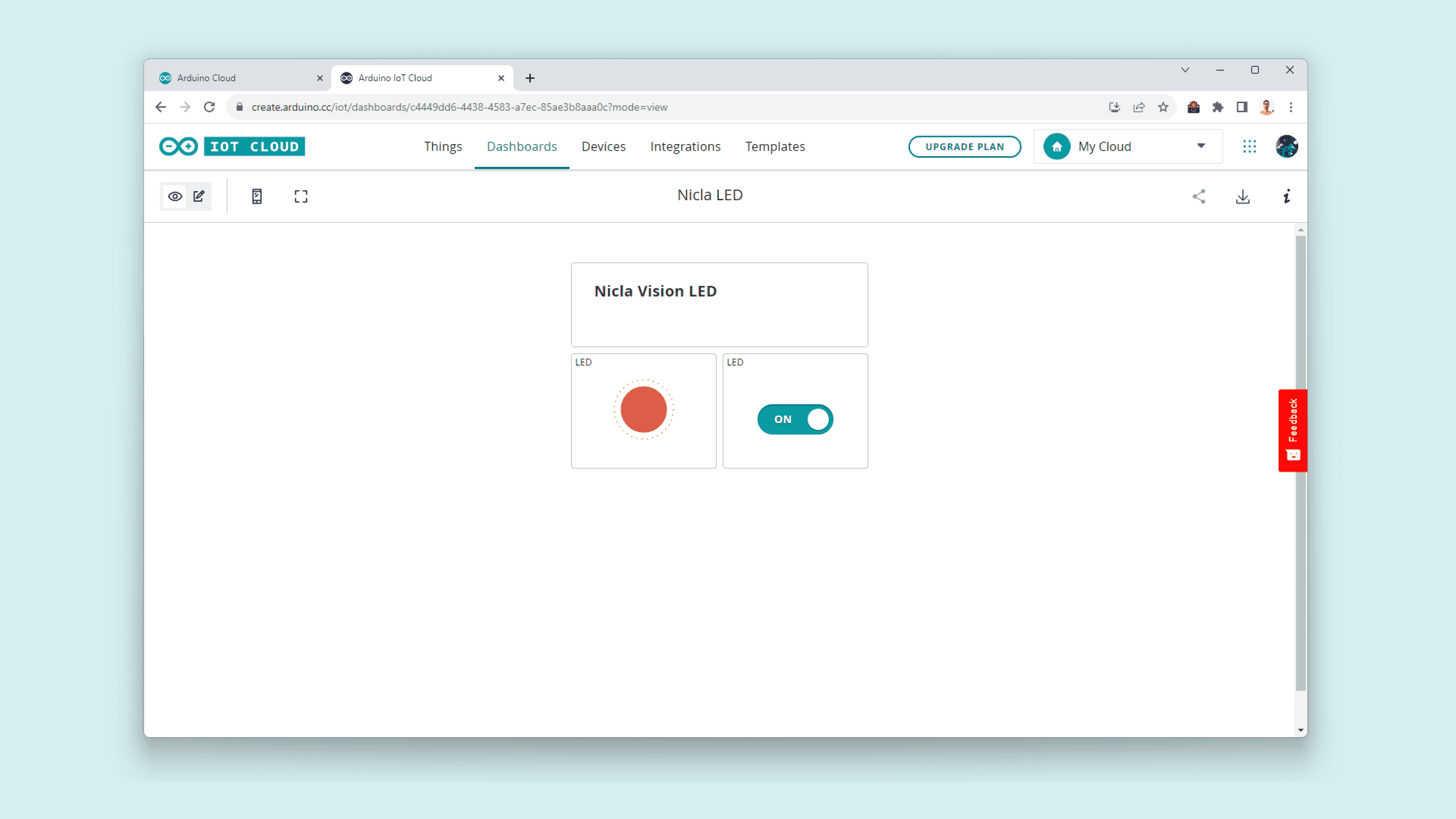 By using the Arduino Cloud, you can, for example, monitor your Nicla's inputs and sensors, control your device's built-in LEDs remotely, and update your device's firmware OTA.